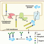 N-Glycosylation Rekayasa, pada teknik baru, secara metabolikal mengganti E. colidengan menghasilkan hexasaccharide terhubung dengan lipid. Dua enzim C. jejuniterekayasa (merah muda dan hijau) menempel pada protein (biru) pada periplasma (antara cytoplasmic dan membran sel). Pada in vitro, glycans menghiasi dan glycan yang dibuat ditambahkan secara enzimatikal.